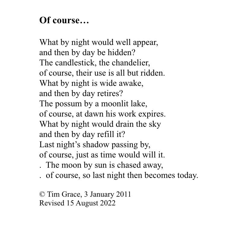 To the poet: The familiar form of the riddle, with its question/answer format, frames this sonnet. The phrase “What by night?” established the seek and find enquiry. Two problems followed. Firstly, contrivance. The thought of ‘what happened over-night while I was sleeping?’ is easily outstretched; laboured to a tedious length. Secondly, miscellany. There’s little achievement in reaching into a grab-bag of ideas. Lucky-dips may write lists but not poems. What rescued this sonnet is its final couplet… an answer worthy of the question.